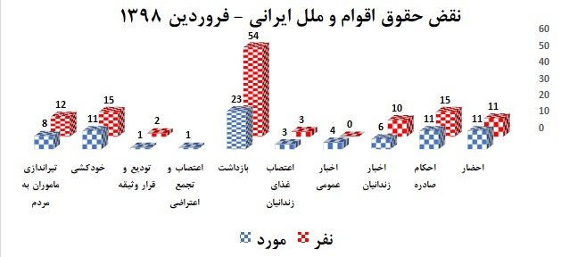 یادآوری:با توجه به سانسور خبری حاکم بر رسانه های ایران، این گزارش تنها بیانگر گوشه هائی از نقض حقوق اقوام مختلف ایرانی است که توسط خبرگزاری های مورد تائید ایران، بازتاب داده شده است و نمیتواند بیانگر نقض گستردۀ این قشر بزرگ از هم میهنانمان باشد.