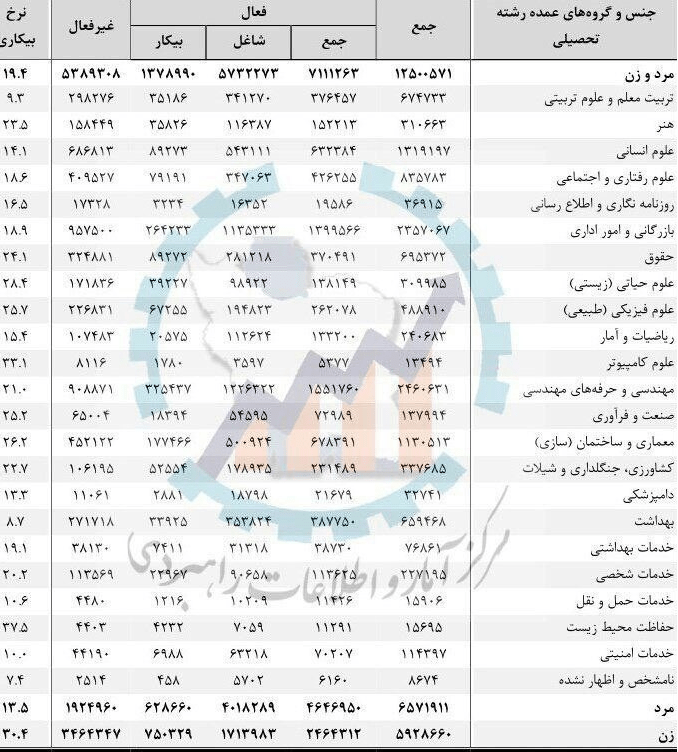 مرکز آمار و اطلاعات راهبردی در ابتدای سال جاری آمارجدیدی را منتشر نموده که بر اساس آن، رشته حفاظت از محیط زیست با ۳۷.۵ درصد بالاترین نرخ بیکاری و رشته بهداشت با ۸.۷ درصد پایینترین نرخ بیکاری را در میان فارغ التخصیلان داراست و رشتههای علوم کامپیوتر با ۳۳.۱ درصد، رشته علوم حیاتی(زیستی) با ۲۸.۴ درصد، رشته معماری و ساختمان سازی با ۲۶.۲ درصد، رشته علوم فیزیکی (طبیعی) با ۲۵.۷ درصد، رشته صنعت و فرآوری با ۲۵.۲ درصد و رشته حقوق با ۲۴.۱ درصد و به ترتیب رتبه های بعدی نرخ بیکاری این عزیزان را بخود اختصاص داده اند که متاسفانه سهم زنان فقط در اینگونه موارد از سهم مردان بیشتر است یعنی نرخ بیکاری در زنان ۳۰.۴ درصد و در مردان ۱۳.۵ درصد را نشان می دهد.