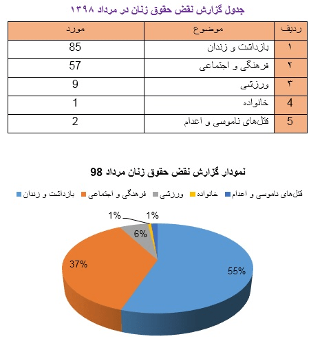 زن سرپرست خانواری که در استان کهگیلویه و بویراحمد به علت ناتوانی در پرداخت اجاره خانه به مبلغ ناچیزی در زندان به سر می برد، با کمک مالی خبرنگاران یاسوج آزاد شد. در حاشیه نشست خبری مدیرکل زندان های استان کهگیلویه و بویراحمد به مناسبت ۱۷ مرداد روز خبرنگار، وقتی خبرنگاران یاسوج متوجه شدند که زن سرپرست خانواری در یاسوج تنها به خاطر ناتوانی در پرداخت مبلغ ناچیزی در 5 مرداد به زندان افتاده همت کردند و با پرداخت آن مبلغ او را نجات دادند. این زن سرپرست خانوار به دلیل پرداخت نکردن کرایه خانه توسط صاحب خانه اش به زندان افتاده و چون قادر نبود کرایه خانه اش را پرداخت کند چند ماهی است که در زندان به سر میبرد. در همین نشست مراحل قانونی برای آزادسازی این زندانی زن سرپرست خانوار انجام شد.(ایسنا ، 17 مرداد 1398)لایحه تابعیت به فرزندان زنان ایرانی از سوی شورای نگهبان به دلیل «بروز مشکلات و مسائل امنیتی» بار دیگر تایید نشد. عباسعلی کدخدایی سخنگوی شورای نگهبان روز شنبه ۱۹ مرداد درباره تعیین تکلیف لایحه تابعیت به فرزندان زنان ایرانی گفت که تبصرهای به این لایحه در مجلس اضافه شده بود که آن هم خلاف موازین شرع و قانون اساسی شناخته شده است. وی افزود : اطلاق اعطای تابعیت نسبت به مواردی که خوف بروز مشکلات و مسائل امنیت وجود داشته باشد خلاف موازین شرعی و قانون اساسی اعلام شد.(صدای آمریکا، 19 مرداد 1398)