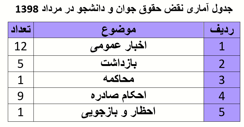 گزارش فوق از سایت کمیته جوان و دانشجو برگرفته از رسانه های داخلی و خارجی همچون هرانا، فارس، ایلنا، ایرنا، هه نگاو، کمپین فعالان بلوچ، جوان آنلاین، دانشجو آنلاین میباشد. لازم بذکر است که بدلیل سانسور شدید رسانه های وابسته به جمهوری اسلامی ایران و از سوی دیگر سرکوب فعالان و خبرگزاری های غیروابسته آمار فوق تنها درصد ناچیزی از نقض حقوق جوان و دانشجو در ایران میباشد. برای آگاهی و اطلاع بیشتر میتوانید از بازدید فرمایید.
