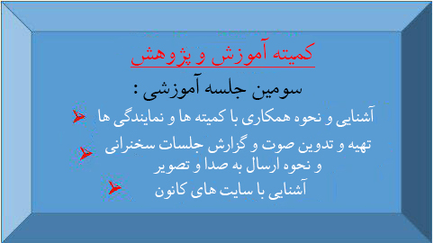 سومین دوره های آموزشی از سوی کمیته آموزش و پزوهش با موضوع (آشنایی و نحوه همکاری با کمیته ها و نمایندگی ها ، تهیه صورتجلسات و گزارشات ، تهیه و تدوین صوت جلسات و نحوه ارسال به صدا و تصویر- آشنایی با سایت های کانون ) با مسئولیت جناب محمد گلستانجو ، روز پنجشنبه ۱۲ سپتامبر ۲۰۱۹ در اتاق پالتاک آموزش برای اعضا جدید و قدیم برگزار گردید که دوستان و علاقمندان میتوانند از لینکهای ذیل موضوعات آموزشی مورد نظر خود را دریافت نمایند :