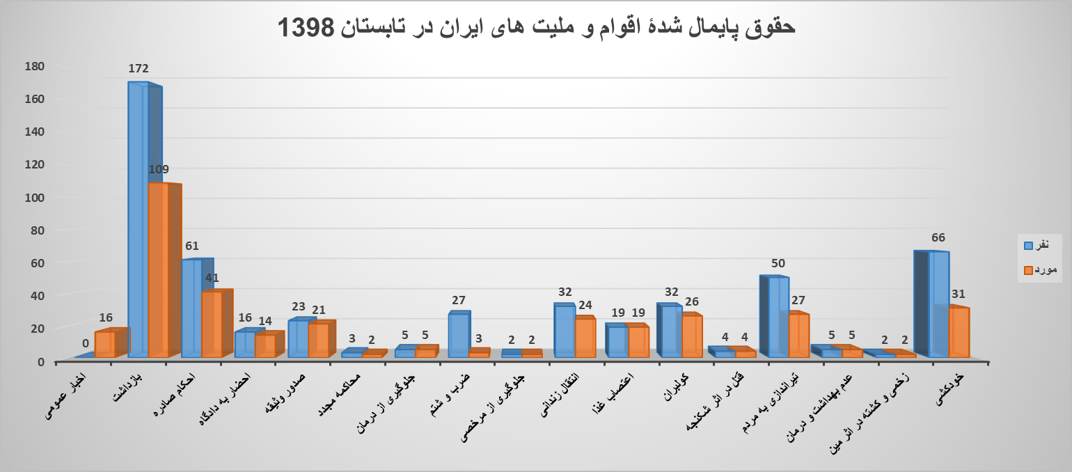 یادآوری:با توجه به سانسور خبری حاکم بر رسانه های ایران، این گزارش تنها بیانگر گوشه هائی از نقض حقوق اقوام مختلف ایرانی است که توسط خبرگزاری های مورد تائید ایران، بازتاب داده شده است و نمیتواند بیانگر نقض گستردۀ این قشر بزرگ از هم میهنانمان باشد.