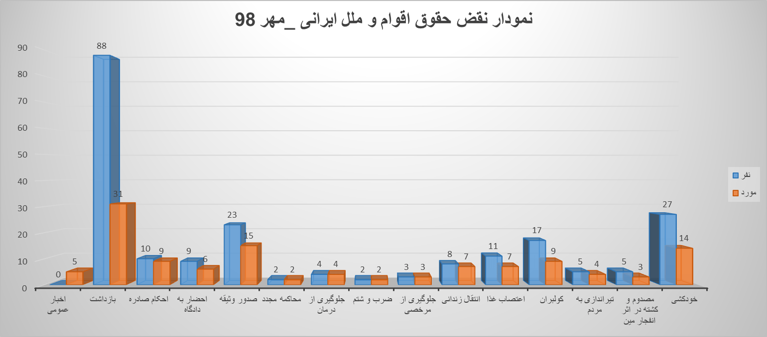 یادآوری:با توجه به سانسور خبری حاکم بر رسانه های ایران، این گزارش تنها بیانگر گوشه هائی از نقض حقوق اقوام مختلف ایرانی است که توسط خبرگزاری های مورد تائید ایران، بازتاب داده شده است و نمیتواند بیانگر نقض گستردۀ این قشر بزرگ از هم میهنانمان باشد.