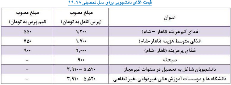 هیأتی با نام فریبندۀ «صندوق رفاه دانشجویان»هر۶ ماه یکبار، قیمت های جدیدغذا و اجاره بهای سکونت دانشجویان در خوابگاه را تعیین و به دانشگاه های ایران ابلاغ مینمایند اما این ارقام طی اطلاعیه ها و بخشنامه های داخلی به کررات تغییر می کند و عجیب ترآنکه قانون تبعیض نه فقط در نوع جنسیت و انتخاب رشته و .دانشجویان بلکه در همۀ امور آنان حاکم است حتی در قیمت و کیفیت غذای دانشجوئی و در طبقه بندی کم، متوسط و پُر هزینه، که در نهایت به ارائه غذاهائی با کیفیت نامطلوب و ناسالم ختم میشود.