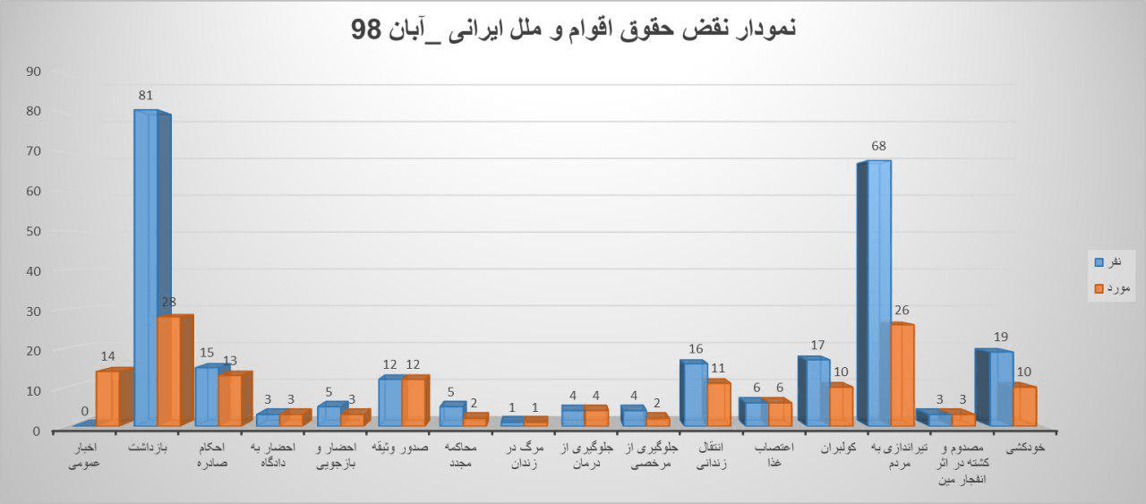 یادآوری:با توجه به سانسور خبری حاکم بر رسانه های ایران، این گزارش تنها بیانگر گوشه هائی از نقض حقوق اقوام مختلف ایرانی است که توسط خبرگزاری های مورد تائید ایران، بازتاب داده شده است و نمیتواند بیانگر نقض گستردۀ این قشر بزرگ از هم میهنانمان باشد.