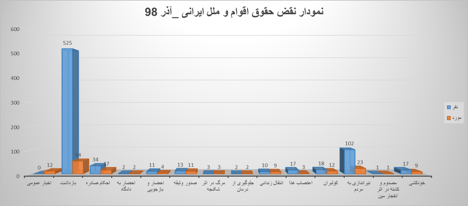یادآوری:با توجه به سانسور خبری حاکم بر رسانه های ایران، این گزارش تنها بیانگر گوشه هائی از نقض حقوق اقوام مختلف ایرانی است که توسط خبرگزاری های مورد تائید ایران، بازتاب داده شده است و نمیتواند بیانگر نقض گستردۀ این قشر بزرگ از هم میهنانمان باشد.
